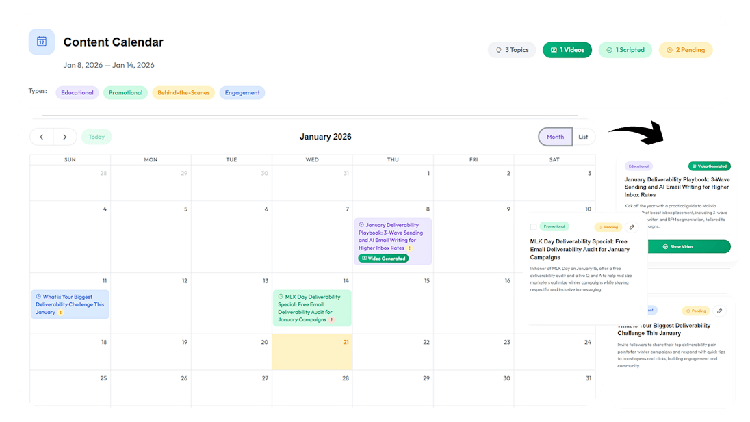 Once the brand profile is ready, Micro Content Agency generates a full 30-day video content calendar. Every topic is tailored to the business and organized for maximum impact.