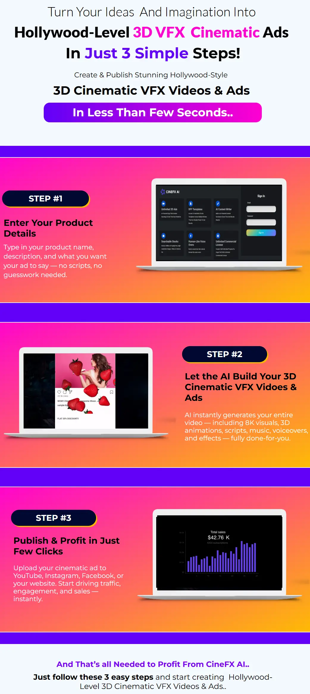 This is where CineFX AI changes the game. It’s the first AI tool that can instantly turn any product, service, or brand into a high-quality 3D video — just like a movie trailer. It helps you get attention and boost sales in under a minute, without needing any special skills or experience.