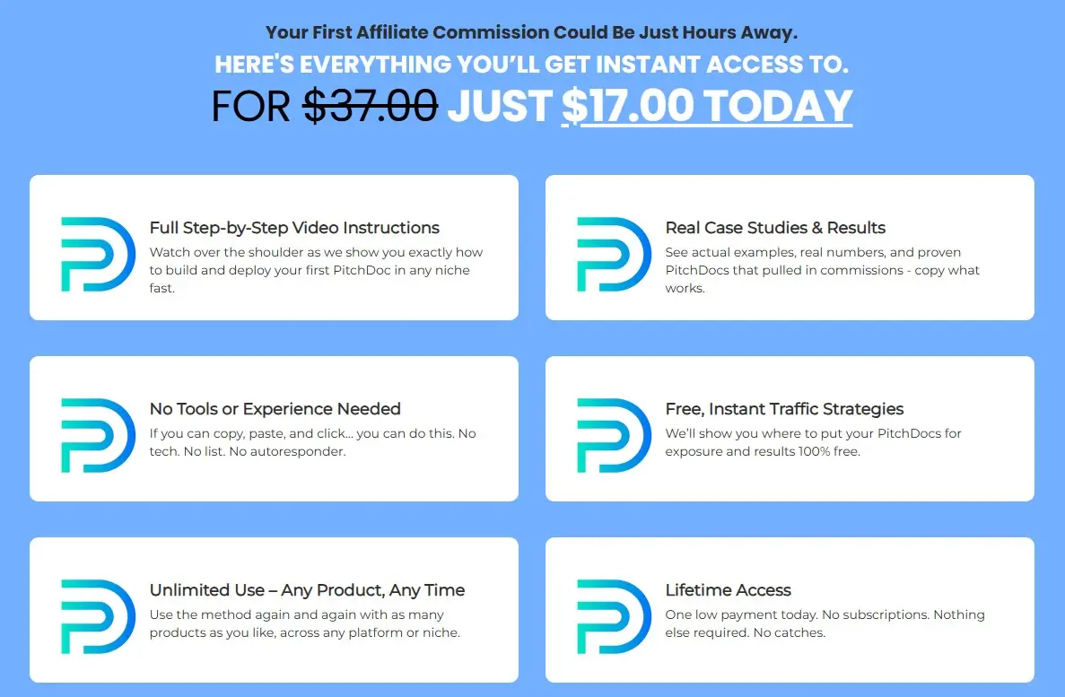 You can get full access to PitchDoc right now for just $17. This includes the complete video training, real case studies, and a proven system you can use repeatedly to earn commissions. It is a one-time payment with no hidden fees or extra tools needed.